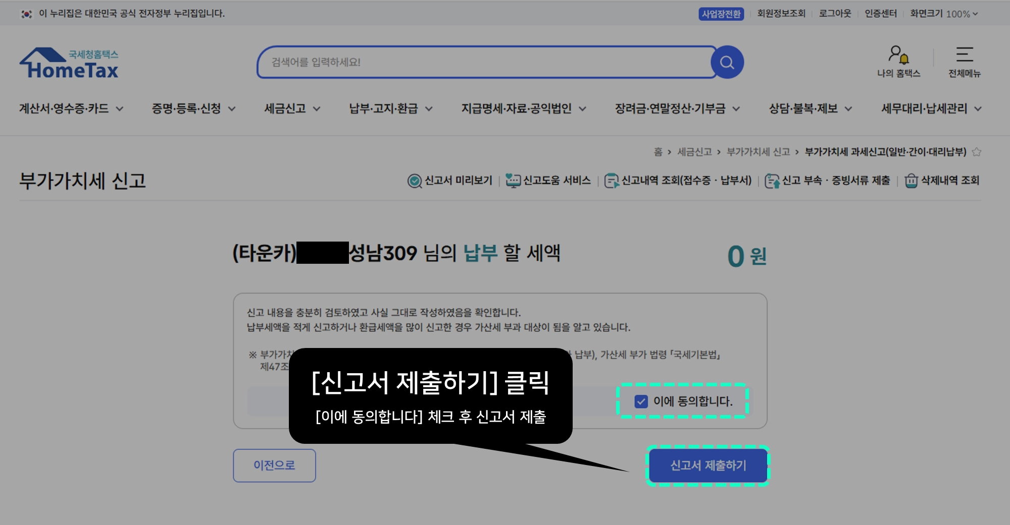 [이에 동의합니다] 체크 → [신고서 제출하기] 버튼 클릭 → 신고서 최종 제출완료