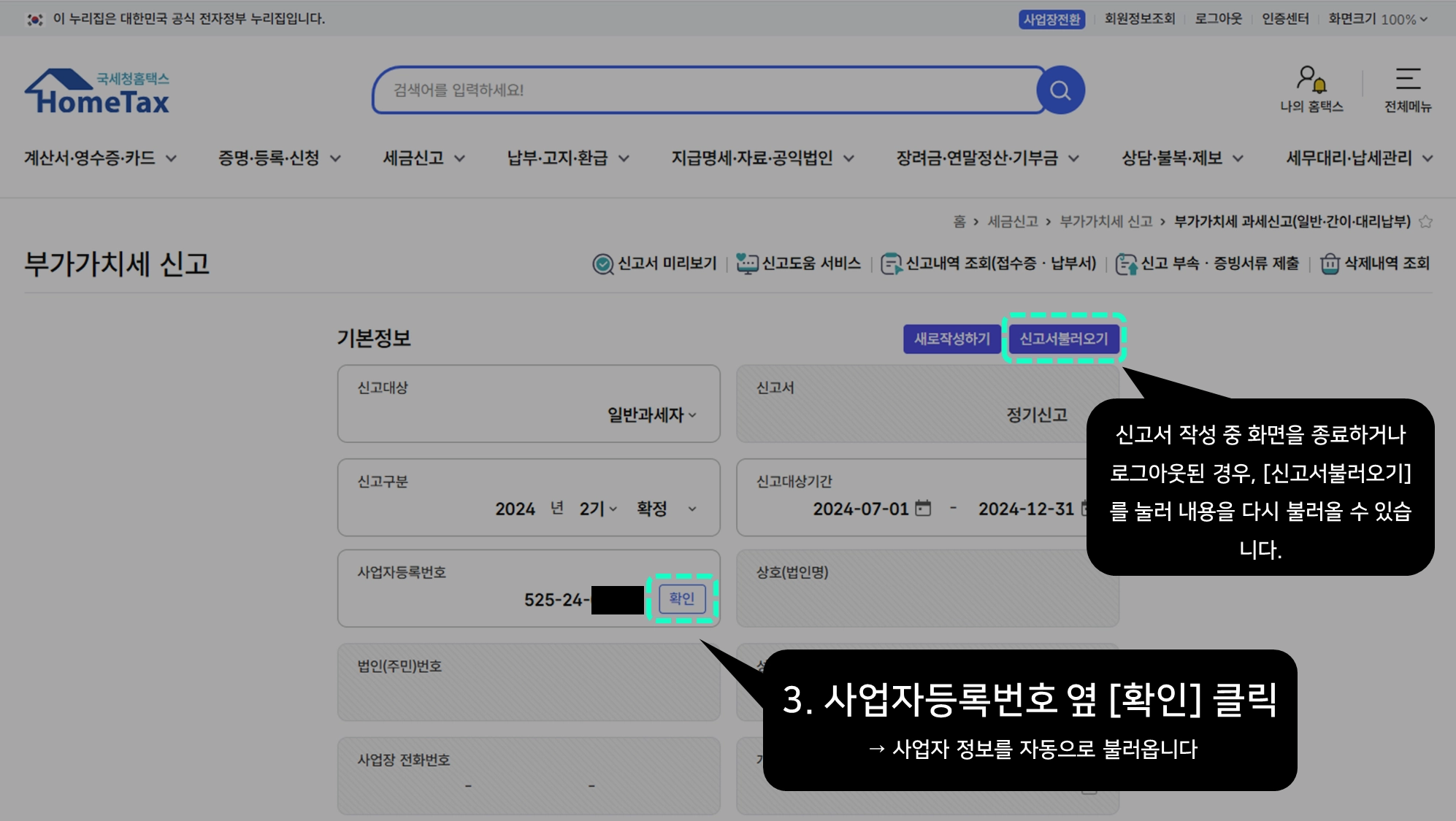 ② 또한 신고 대상 과세 기간에 매입(비용 지출) 내역만 있는 경우에는 매입세액만 입력하여 신고해주시면 됩니다.