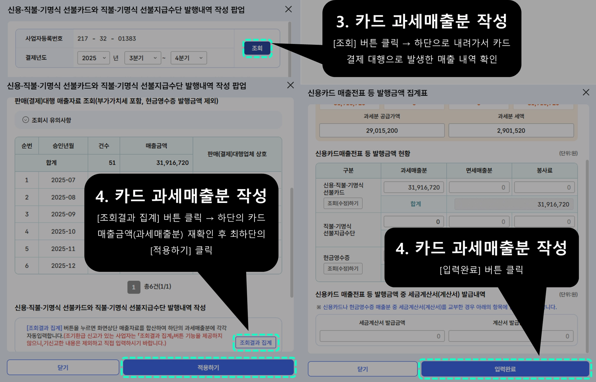 3번~5번에서 미리 매입세액 공제대상으로 등록해둔 결제 정보를 자동으로 불러옵니다