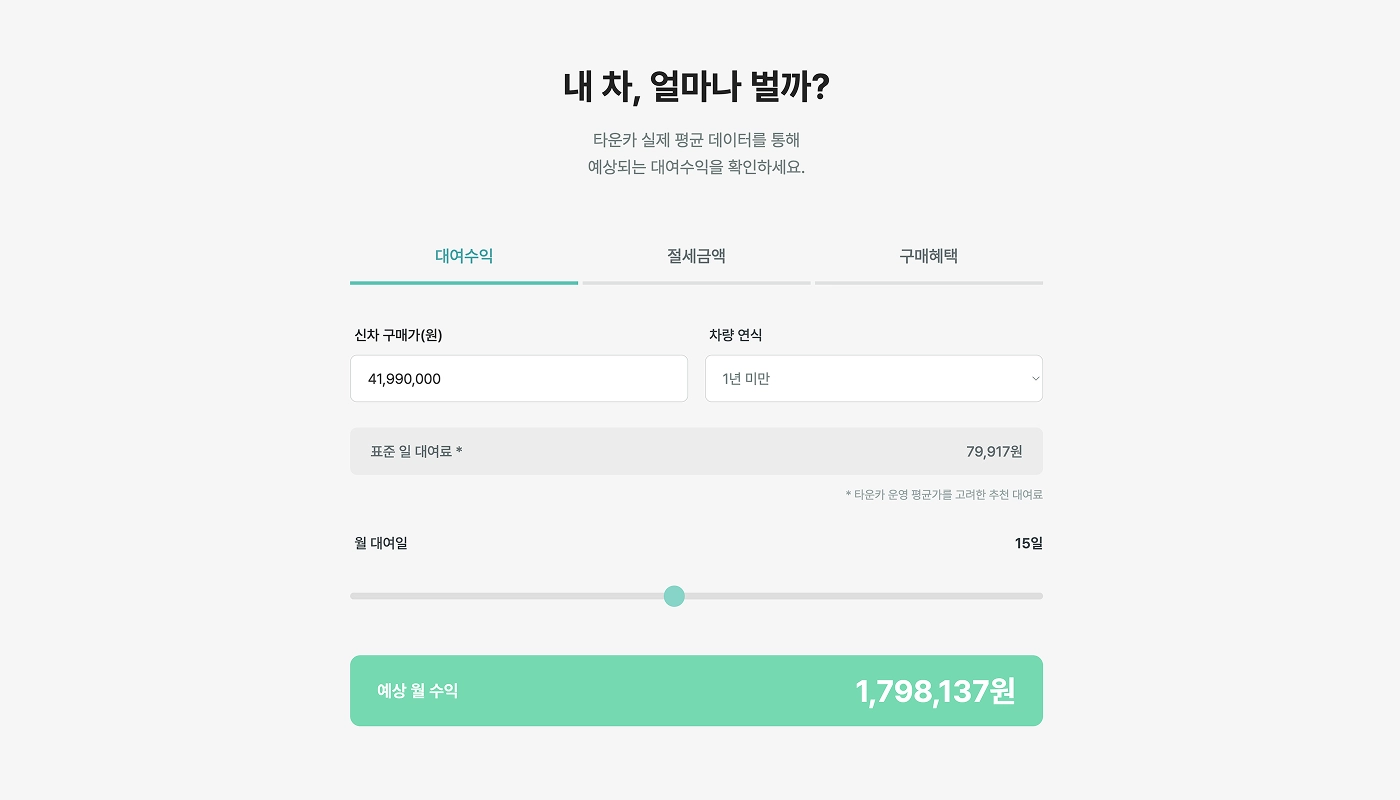 "내 차로 한 달에 어느 정도 수익이 날까요?" 많은 예비 차주님들이 궁금해하시는 질문입니다. 이제 고민하지 마세요. 타운카가 준비한 [예상 수익 계산기]를 통해 10초 만에 확인하실 수 있습니다.