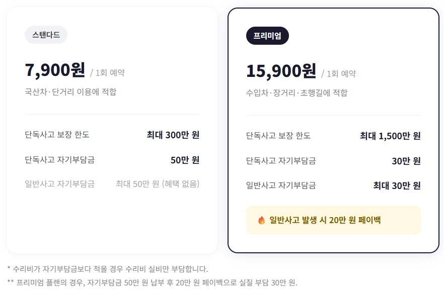 일반사고 자기부담금 일부 페이백 (예약 승인 후 전용보험 가입 필수)