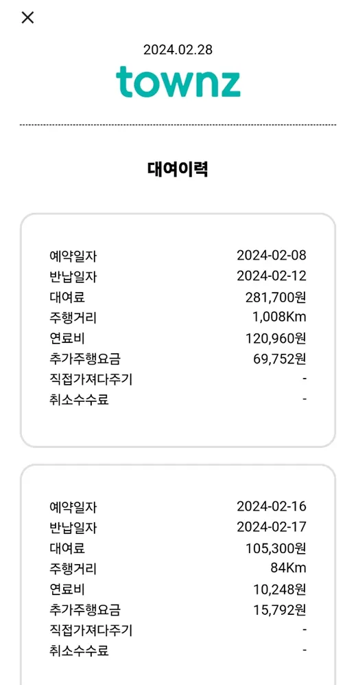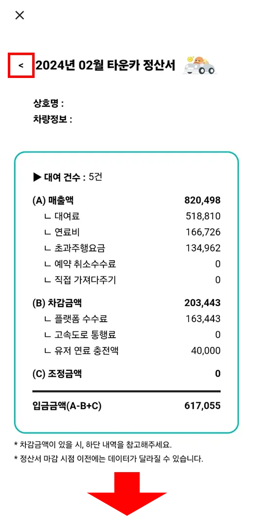 타운카 앱 내 정산서 페이지에서 내 차의 대여수익 정산내역을 확인할 수 있어요!