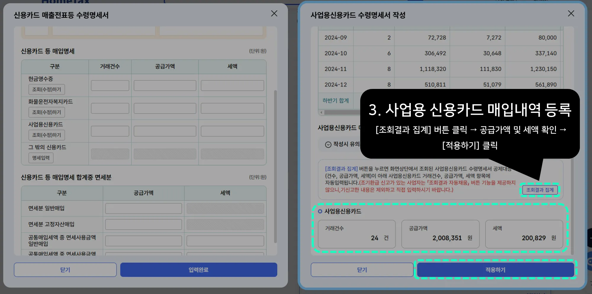 12. 신용카드로 결제했거나 현금영수증을 발급받은 매입금액(사업경비) 입력하기